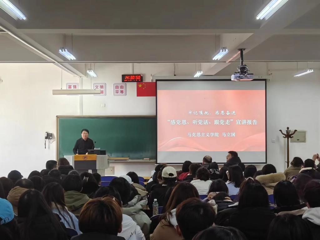 为持续深入学习贯彻习近平总书记对内蒙古的重要指示批示精神,2月29日,必赢nn699net举办“感党恩、听党话、跟党走”主题宣讲会,学院党委委员、副院长骆静主持会议,全体教师、师生党员及学生代表参加。宣讲会邀请马克思主义学院思政课教师马立国进行宣讲。