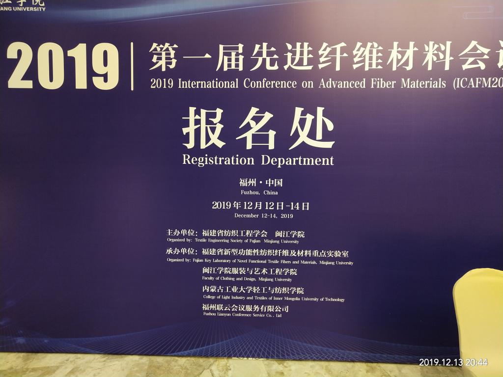 由闽江学院主办,福建省新型功能性纺织纤维及材料重点实验室、闽江学院服装与艺术工程学院、我校必赢nn699net承办的2019年第一届先进纤维材料国际学术会议于12月13日至15日在闽江学院召开。会议主题为先进纤维制造、高性能纤维复合材料、智能可穿戴纺织品、先进纺织加工工艺等。