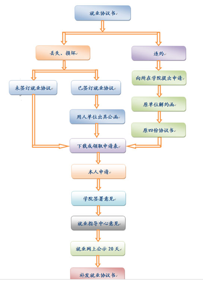 四、提出违约的毕业生在招生就业处网站下载并如实填写《必赢nn699net就业协议书补发申领表(违约)》,经学院分管院长签字同意后,到学校招生就业处审批。上述手续经学校招生就业处就业指导中心审核批准后,在网上公示20天,无异议后,毕业生可重新领取《协议书》,另行择业。