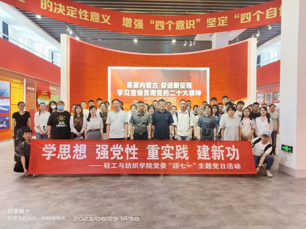 为推动主题教育走深走实,进一步强化党员的政治意识、责任意识、身份意识,激发干事创业的热情。在“七一”建党节来临之际,6月29日,轻工与纺织学院党委举办了“学思想、强党性、重实践、建新功”主题党日活动,组织全体师生党员前往内蒙古展览馆参观学习“亮丽内蒙古 奋进新征程——学习宣传贯彻党的二十大精神”主题展,重温入党誓词。