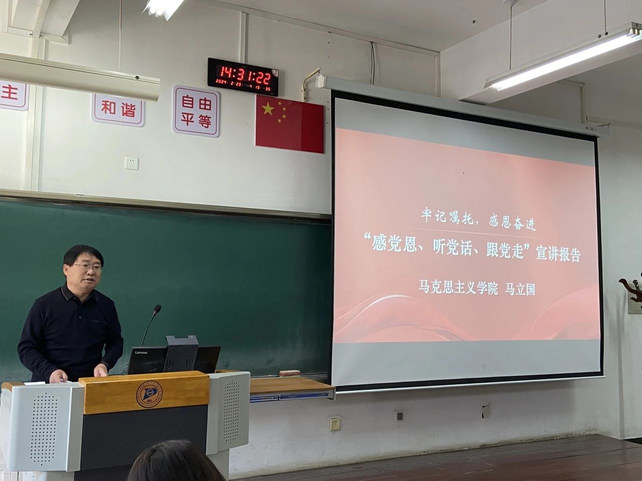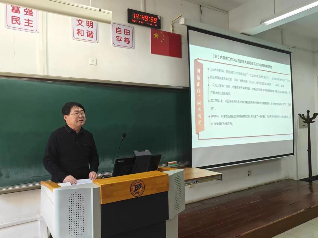 马立国老师以“牢记嘱托,感恩奋进”为主题,聚焦学习贯彻习近平总书记对内蒙古的重要指示精神,围绕深刻领会把握“六句话的事实和道理”,结合具体事例,深入浅出地进行了系统的介绍和解读。宣讲内容具有很强的指导意义,让全体师生深切体悟习近平总书记对内蒙古的关怀厚爱和期望。